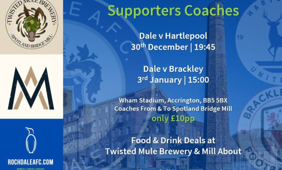 Supporter Coaches For Accrington Home Games Sunday, 7th Dec 2025 21:05 by Chaff Our friends at Twisted Mule and Mill About are looking to provide supporter coaches for the two home games being played at Accrington Stanley while our pitch is being reconstructed.